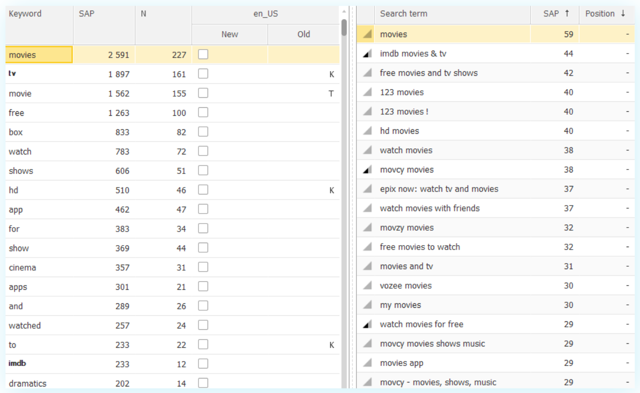 Все запросы мы разбиваем на слова, суммируем их в SAP (Apple Search Popularity – показатель популярности запроса, от 5 до 100). Мы его берем из Apple Search Ads. Это единственный официальный источник популярности, т.е. трафиковости запроса. Все другие источники тоже основываются на нем. Затем отсортировываем слова и получаем список самых популярных запросов, которые использовать в метаданных. Например, запрос «movies» имеет суммарную популярность более 2,5 тысяч и используется в более, чем 200 фраз. Справа часть запросов, в которых используется слово movies. Очевидно, что запросы, которые используются редко (у них низкая популярность) не нужно использовать. По этой стратегии вы охватите больше всего связок, среднечастотных и низкокочастотных запросов.