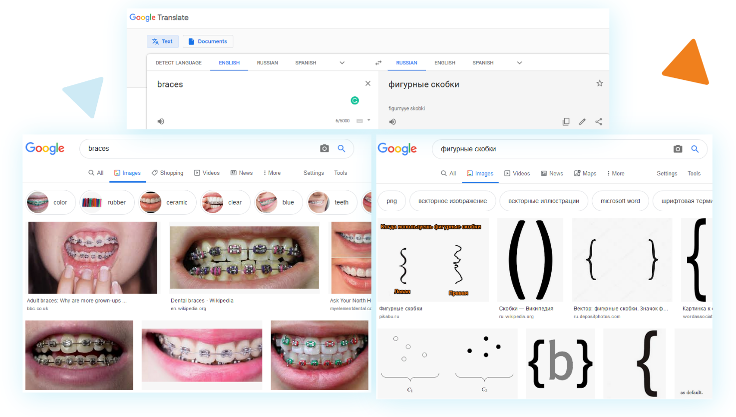 Или запрос «braces» (брекеты) на русский переводится как фигурные скобки. Простейшая проверка через Google Картинки покажет, правильный ли перевод вы получили.
