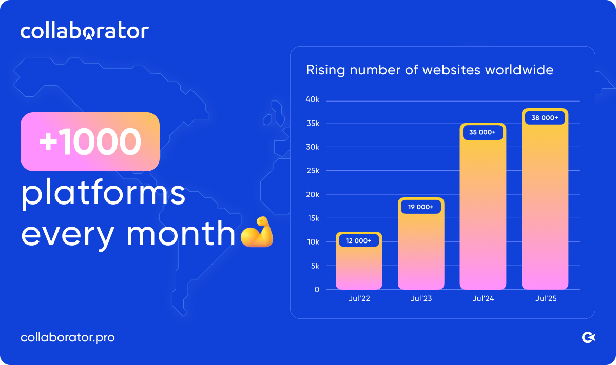 This year, our catalog expanded significantly, not just in size, but in global coverage. Thousands of new platforms joined Collaborator, with verified and active websites now representing over 150 countries and 50+ languages.